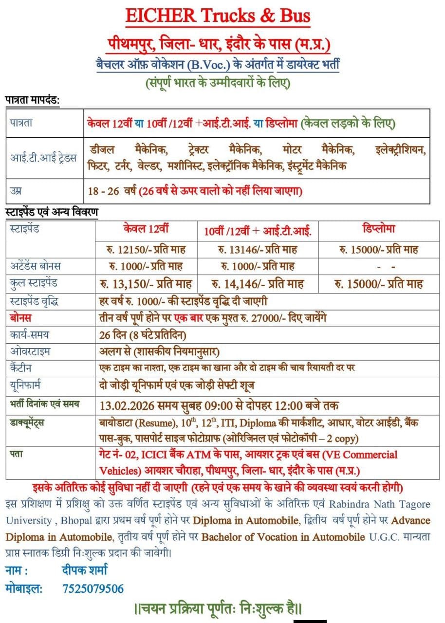 Volvo Eicher Commercial Vehicles Recruitment 2026: A golden opportunity for ITI pass students to get a job. Along with the job, 3 years Bachelor of Vocational Degree (B-VOC) degree will also be given by Eicher Trucks and Bus Company absolutely free. If you want to do a job, then reach the place given below with all your necessary documents on 13 February 2026 at 09:00 AM.