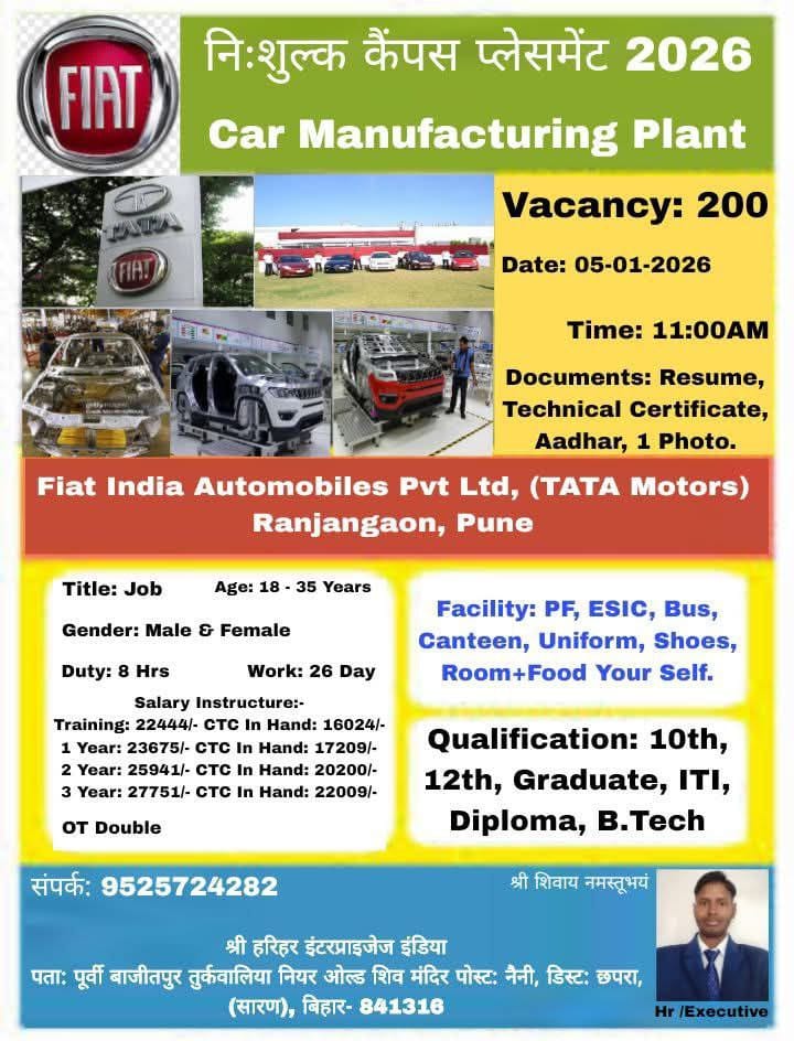 FIAT India Recruitment: FIAT Automobiles India Ltd ने 10th, 12th, ITI, Diploma और Graduation पास छात्रों के लिए ट्रेनी के पदों पर भर्ती निकाली है। 05 जनवरी 2026 को नीचे दिए गए पते पर साक्षात्कार होगा इच्छुक उम्मीदवार वहा जाकर भाग ले सकते हैं।