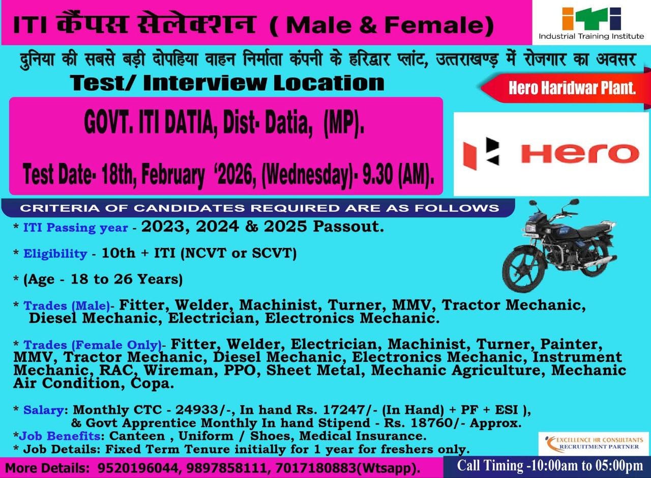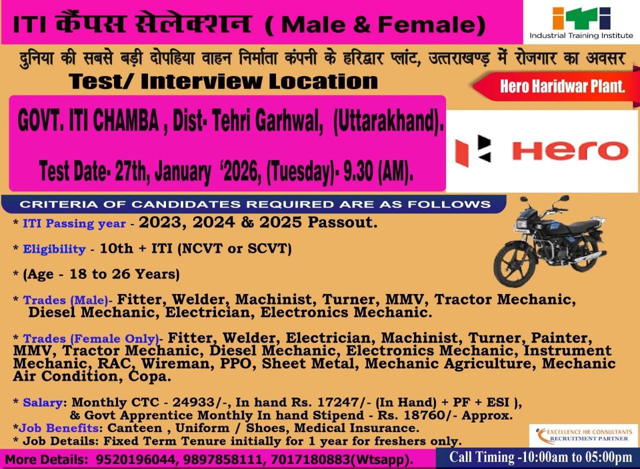 Hero MotoCorp Haridwar Recruitment 2026: Campus placement is being organized by Hero MotoCorp Company for Haridwar Plant. To participate in this campus placement, it is mandatory for the candidate to have passed 10th or ITI. Whoever will be selected for this campus placement will have to work in Hero Company Haridwar. Any person who wants to work in Hero Company Uttarakhand can attend the interview by reaching the given interview venue with all their documents.