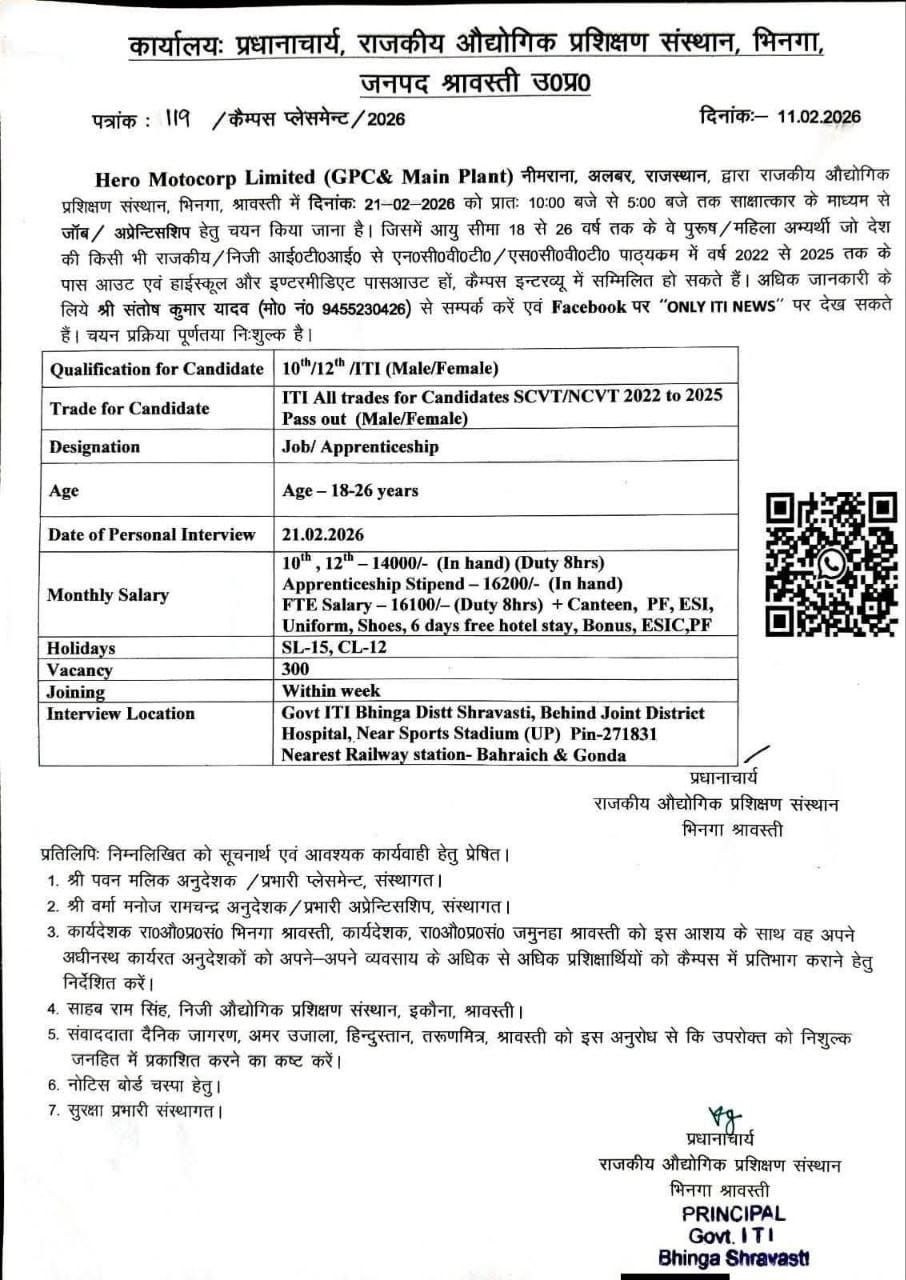 Hero MotoCorp India ITI Campus Placement 2026: – Hero MotoCorp India Limited Company is going to organize the campus placement on 21 February 2026 in which men and women who have passed ITI from SCVT NCVT from 2022 to 2025 can participate in this campus placement.