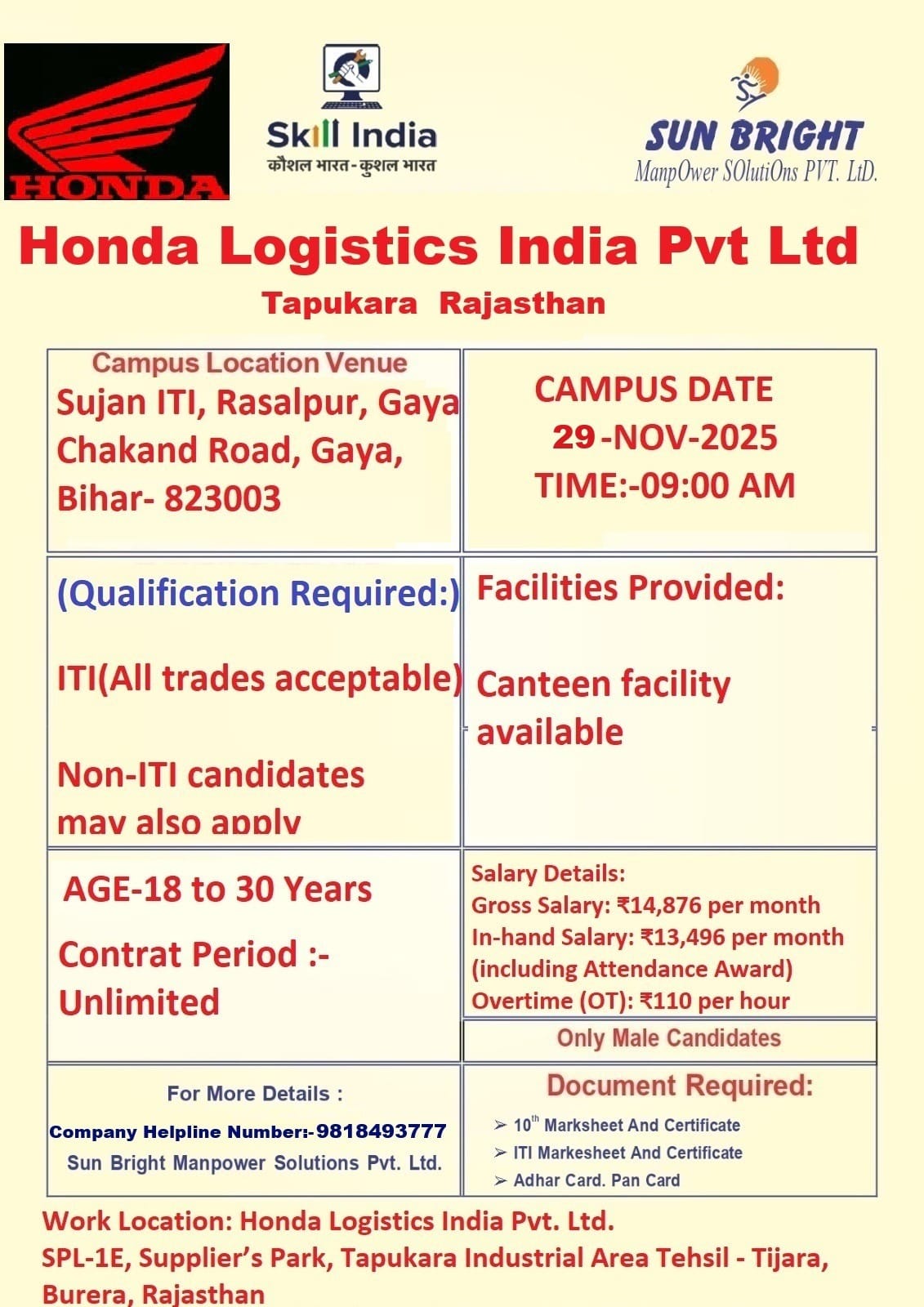 Honda Logistics ने 2025 के लिए नई भर्ती की घोषणा की है जिसमें बड़ी संख्या में ITI पास और 10 वीं पास उम्मीदवारों को मौका दिया जा रहा है। यह भर्ती उन युवाओं के लिए बेहद उपयुक्त है जो अपने करियर की शुरुआत किसी स्थिर और सुव्यवस्थित कंपनी के साथ काम करना चाहते हैं। इस जॉब में उम्मीदवारों को उत्पादन से जुड़े कामों पर नियुक्त किया जाएगा और चयन पूरी तरह से कैंपस प्लेसमेंट के माध्यम से किया जाएगा।