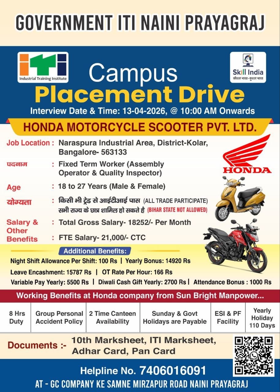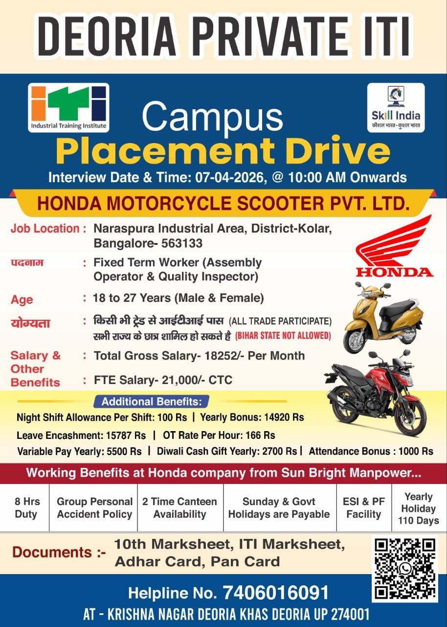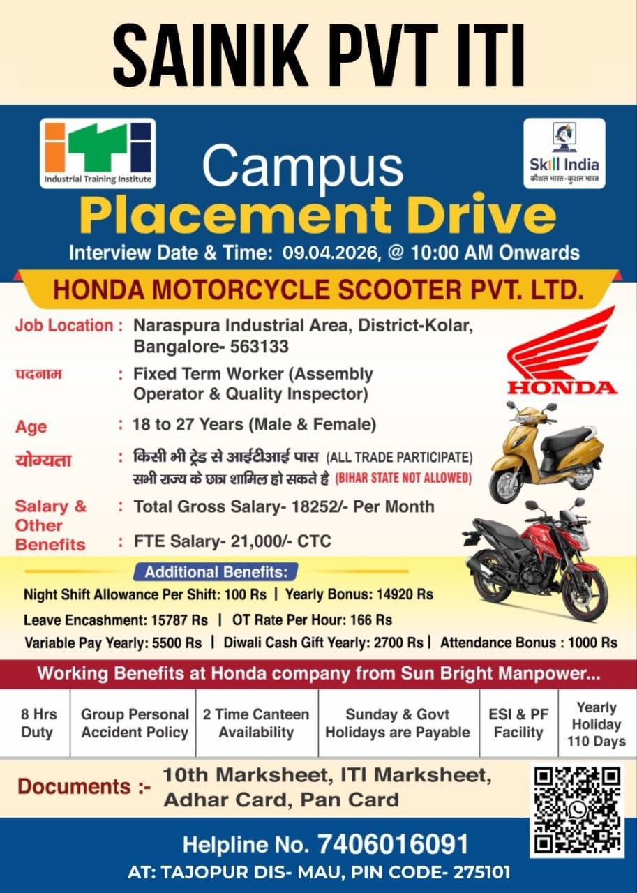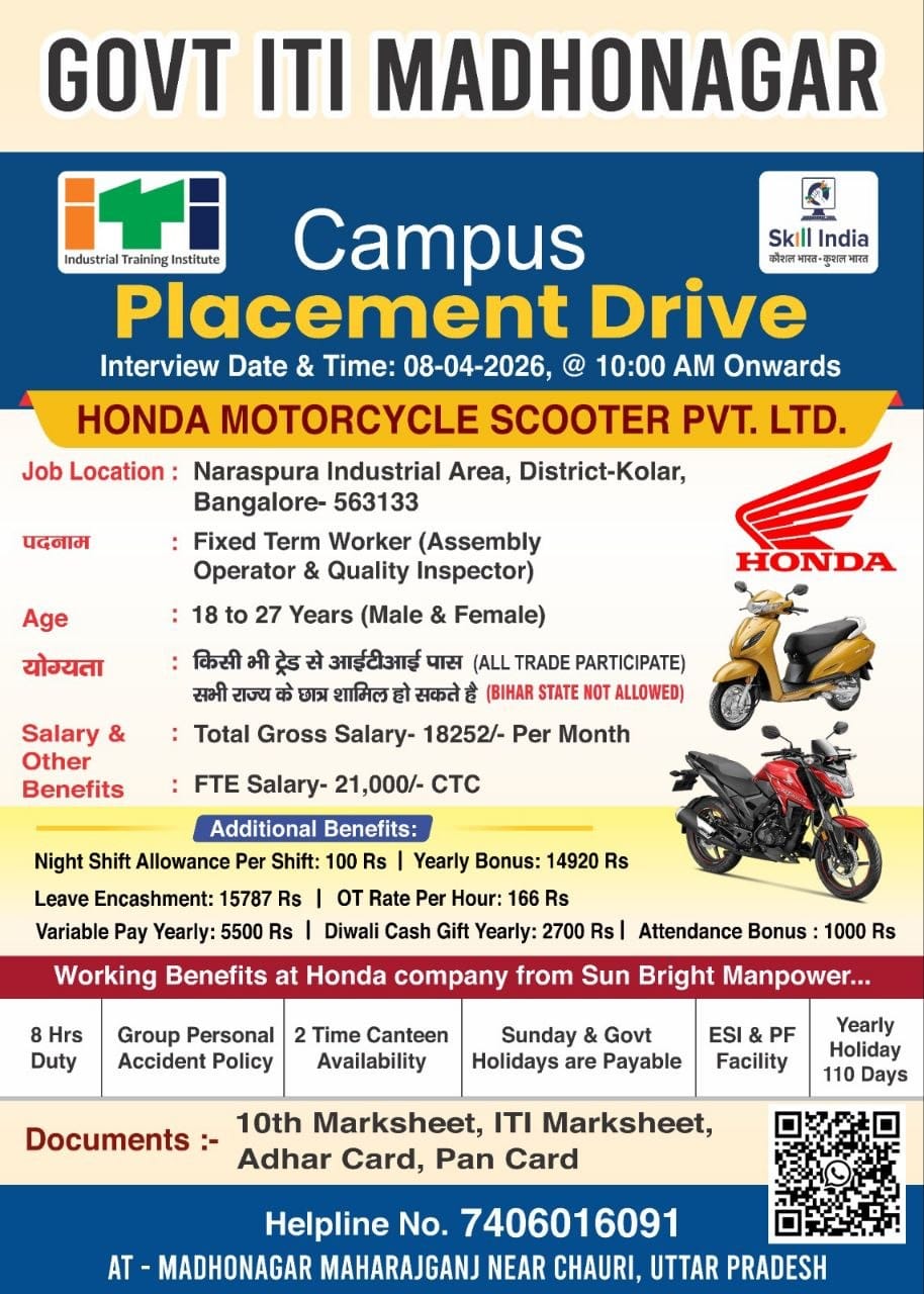 Honda Motorcycle & Scooter Pvt Ltd Company is conducting recruitment for ITI pass candidates.