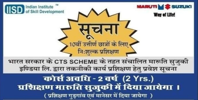भारत सरकार के CTS Scheme के तहत संचालित मारुति सुजुकी इंडिया लिमिटेड द्वारा तकनीकी कार्य प्रक्षिक्षण हेतु प्रवेश सूचना