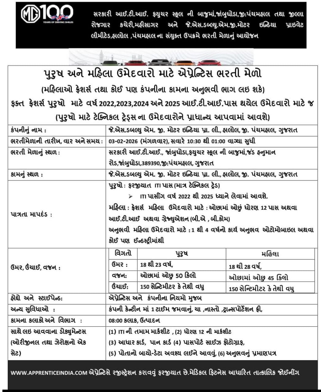 ब्रिटिश ऑटोमोबाइल कंपनी MG Motor के द्वारा कैंपस प्लेसमेंट का आयोजन करने का निर्णय लिया है। आयोजन 03 फरवरी 2026 को होगा और इस कॅम्पस प्लेसमेंट मे आईटीआई टेक्निकल ट्रेड्स के लिए जॉब प्रदान किए जाएंगे।