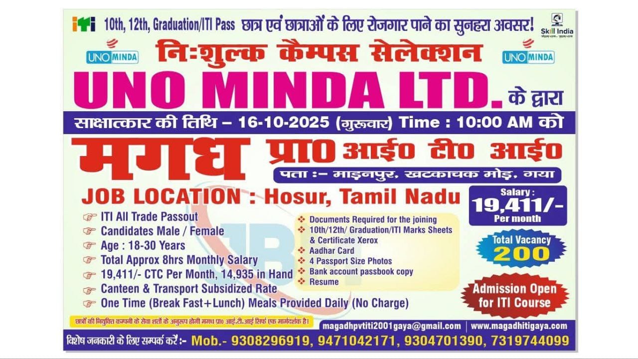 UNO Minda Recruitment 2025: UNO Minda is a leading automotive company that manufactures car components in India. This company has announced the recruitment of candidates for various ITI posts. The company is looking for qualified and motivated candidates who can contribute to the growth of the organization. ITI Recruitment Drive is expected to provide employment opportunities to skilled professionals and latest candidates who have completed their ITI Certificate.